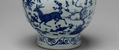 瓶体呈直口、双圆腹、束腰、外撇圈足的 葫芦形制 ,底部书有“ 大明嘉靖年制 ”楷书款。这种造型象征道家仙丹容器,体现了嘉靖帝崇道炼丹的宫廷文化。 纹饰与寓意瓶身以青花釉下彩绘装饰:口沿:绘 云鹤纹 ,鹤为道教祥瑞,象征长寿。 腹部:绘 鹿鹤同春图 ,鹿与鹤和谐共处,寓意吉祥、长寿、富贵,反映了道教“六合同春”的宇宙观。 束腰处:以锦地菱形开光过渡,内绘折枝花卉(如牡丹、莲花),增强装饰层次。