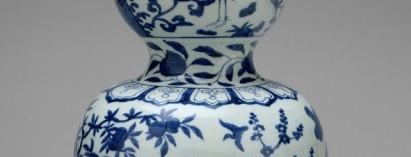 明嘉靖青花云鹤纹葫芦瓶为明代嘉靖年间瓷器。该器物因嘉靖帝崇奉道教、追求长生而盛行,葫芦形制象征道家仙丹容器,青花发色与云鹤纹饰分别对应道教崇尚的玄色与长寿寓意。瓶体呈直口、双圆腹、束腰、外撇圈足造型,底部书“大明嘉靖年制”楷书款。其形制端庄,纹饰融合宗教信仰与工艺美学,既是明代道教文化影响的实物见证,亦展现嘉靖时期青花瓷的艺术特征。