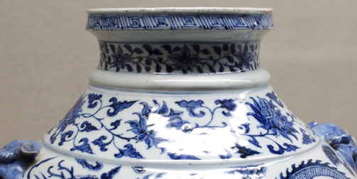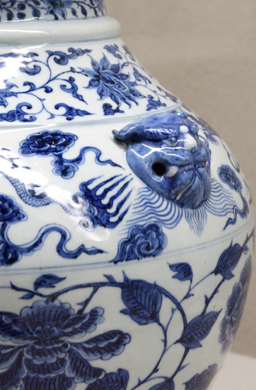 青花龙牡丹卷草纹双耳罐高38.7厘米,直径32.6厘米,重7640克。原应有盖,主体纹饰为上下分段的云龙纹与缠枝牡丹纹,辅以卷草纹;兽面双耳带孔道可加环,青花使用进口钴料,发色浓郁,花瓣与叶片采用阴刻填钴工艺。龙纹与牡丹组合罕见,体现元代青花大型器的极致工艺。