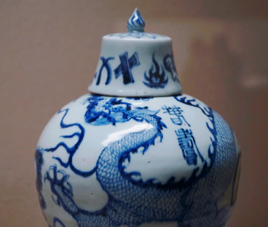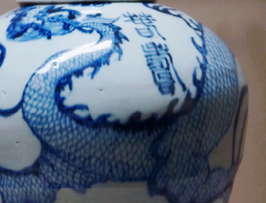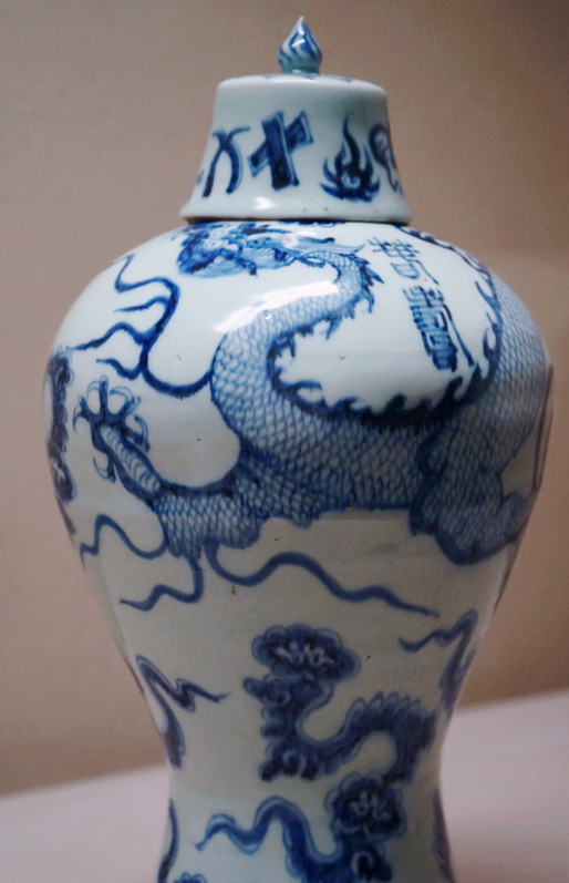 云龙纹梅瓶为敞口,束颈,丰肩敛腹,下部外撇似风尾,钟形盖,内圈足。白地蓝花。主纹绘云龙。龙口衔火球,龙身展五爪,驾着祥云一朵朵,威武雄壮地腾飞,不同形态的云纹点缀其问。肩部特书“春寿”二字吉语款,是洪武朝不多见的规整篆款。 “春寿”铭梅瓶以篆书书写,这在元末明初的同类器型上都是极为罕见的。据北京马希桂先生在《中国青花瓷》一书中统计,“同类型的‘春寿’款瓶,传世的只见四件,两件存国内,两件流散于日本和英国”,日本这件梅瓶是唯一带盖的