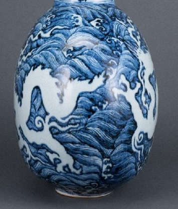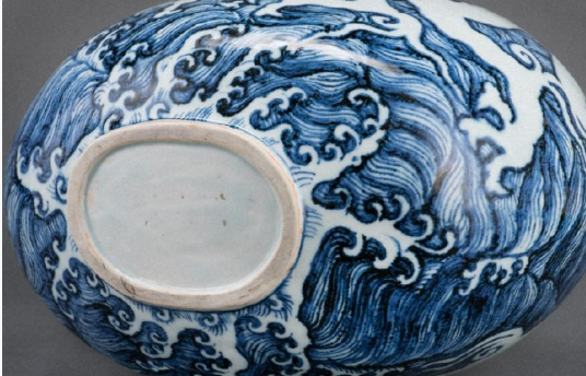 明永乐青花龙波涛纹扁壶(亦称海水龙纹扁壶),该馆藏品的青花发色浓艳,采用进口钴料“苏麻离青”,釉面可见银黑色结晶斑点,海水纹与留白龙纹形成强烈对比,龙形矫健腾跃于惊涛之上;整体呈圆口、长颈、扁圆腹、平底结构,部分器物底部为椭圆形浅圈足3。其装饰层次分明,颈部绘卷草纹与缠枝莲纹,腹部则以青花留白海水龙纹为核心——一条矫健威猛的白龙回首曲体,须发飘扬,四肢伸张,在波涛汹涌的青花海水纹中遨游,通过青花与留白的强烈对比,营造出汹涌澎湃的动感