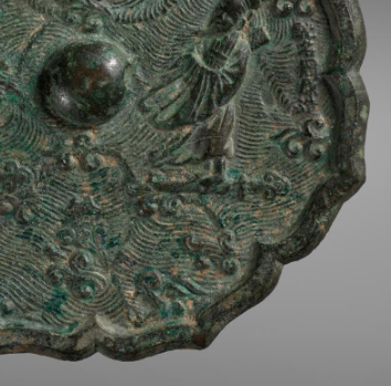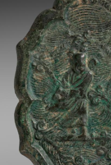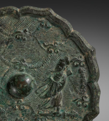 本品规格为直径17.6厘米,厚度1厘米。呈八出菱花形(边缘花瓣状 ),青铜质地,中间设半球形镜钮(用于悬挂 )。表面因岁月氧化覆绿锈,镜背浮雕工艺精湛 —— 人物、海浪、云纹一体成型,展北宋 “菱花镜” 制式与 “高浮雕铸造” 的高超技艺,尽显工匠巧思。镜背核心是 “人物故事” 场景(两人着古装,或为 “仙人渡海”“高士对谈” ),衬以汹涌海浪、云纹(似表现超凡意境 )。北宋铜镜常借这类纹饰传递 “隐逸文化”“神仙信仰”,此镜或寄托对 “超凡脱俗”“平安顺遂” 的向往,是当时 “以镜叙事” 的典型。