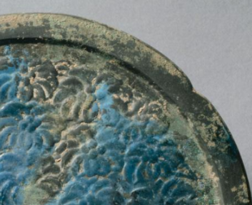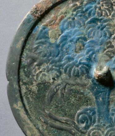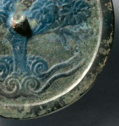 本品规格为直径14.7厘米,厚度0.8厘米。呈圆形(边缘带浅花口 ),青铜质地,中间设半球形镜钮(用于悬挂 )。表面因岁月氧化,呈现蓝绿交织的古朴包浆,镜背浮雕工艺精湛 —— 树形纹饰(树干、枝叶、云纹底座 )一体成型,展北宋 “圆形花口镜” 制式与 “高浮雕铸造” 的高超技艺,尽显工匠巧思。镜背核心是 “树形纹”(枝叶繁茂,树下衬云纹 ),或为 “菩提树”“仙树” 意象(佛教中菩提树象征觉悟,道教仙树寓意长寿 )。北宋宗教文化兴盛,铜镜常借这类纹饰传递 “祈福禳灾”“追求超凡” 的精神诉求,此镜或寄托对 “平安”“长寿” 的向往,是当时 “以镜寓道” 的体现。