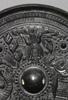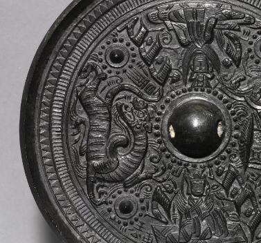 本品规格为直径18.3厘米,厚度1.7厘米。采用 高浮雕 + 线刻 工艺,人物(官吏、仙人 )、车马(车轮、车舆 )“浮出” 镜面约 2 - 3 毫米,衣纹褶皱、车马细节(以线刻表现 )清晰可触;或为 “官吏乘车出行”(车马、侍从 )、或为 “仙人对坐论道”(羽人、方士 ),尽显 “人物车马为故事核心” 的生动性;神兽形态 诡谲灵动(左侧为龙、右侧为虎 ),与人物车马互动(如 “龙虎护佑官吏车马” ),采用 线刻 + 浮雕 结合(躯体浮雕,鳞片、毛发线刻 ),强化 “人神共生” 意象。
