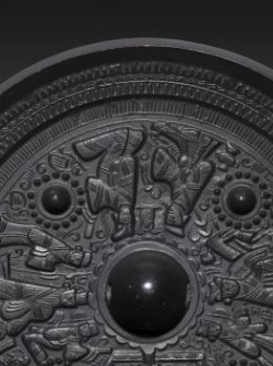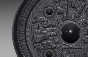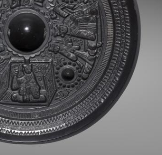 本品规格为直径19.5厘米,厚度1.9厘米。采用 高浮雕 + 线刻 工艺,人物形象 “浮出” 镜面约 2 - 3 毫米,衣纹褶皱(以线刻表现 )清晰可触;或为 “官吏出行”(车马、侍从 )、或为 “仙人对弈”(羽人、方士 ),尽显 “人物为故事核心” 的生动性; 神兽形态 诡谲灵动(或为龙虎、或为朱雀、玄武 ),与人物互动(如 “龙虎护佑官吏”“朱雀伴飞仙人” ),采用 线刻 + 浮雕 结合(躯体浮雕,鳞片、羽毛线刻 ),强化 “人神共生” 意象;半球形小钮(高约 1 毫米 ),表面光滑,与主钮呼应,传递 “天星镇守” 意象(四乳对应 “北斗四星” );外圆饰 锯齿纹 + 云气纹(或铭文带 ),强化 “故事边界”,传递 “世俗场景与天界祥瑞” 的过渡。