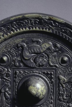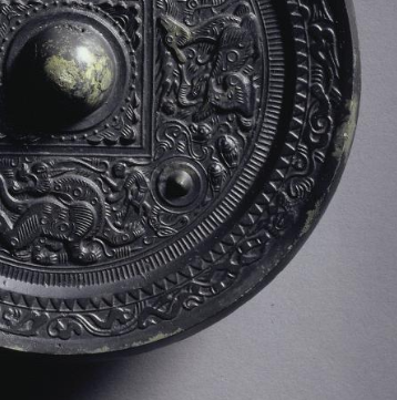 本品规格为直径18.4厘米,厚度2厘米。采用 高浮雕 + 线刻 工艺,神兽躯体 “浮出” 镜面约 2 - 3 毫米,鳞片、羽毛(以线刻表现 )清晰可触;龙虎(或朱雀、玄武 )形态矫健,尽显 “神兽为四神之尊” 的威严;半球形小钮(高约 1 毫米 ),表面光滑,与主钮呼应,传递 “天星镇守” 意象(四乳对应 “北斗四星” );内方边框饰 博局纹(T、L、V 形符号 ),象征 “宇宙经纬”(汉代博局纹与 “六博棋” 关联,代表 “人间秩序” );锯齿纹(强化边界 )与云气纹(象征 “天界祥瑞” )结合,传递 “神兽护佑,祥瑞环绕” 氛围。