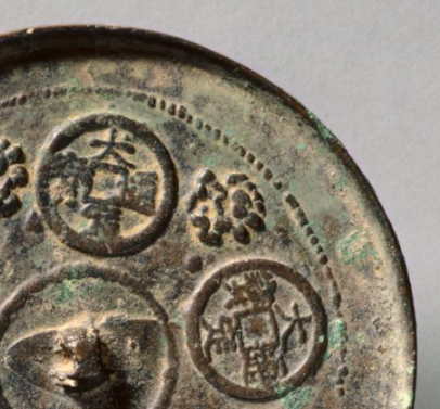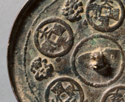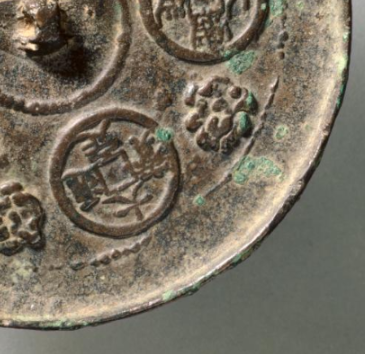 本品规格为直径11.9厘米,厚度0.8厘米。呈圆形,青铜质地,中间设独特的 “桥形镜钮”(区别于常见半球钮 )。表面因岁月氧化覆绿锈,镜背浮雕工艺清晰 —— 钱纹、花卉图案一体成型,展现金代 “圆形铜镜” 制式与 “浮雕铸造” 的工艺水平,尽显工匠巧思。镜背以 “钱纹 + 花卉” 为核心(五枚仿 “大观通宝” 钱币纹 、四组花瓣纹交替排列 )。金代常仿前朝钱币纹(如北宋 “大观通宝” )作镜饰,借 “钱纹” 寓意 “财富满贯”,“花卉” 象征 “美好吉祥”,此镜传递对 “富足安康” 的向往,是金代 “以镜祈福” 的典型。