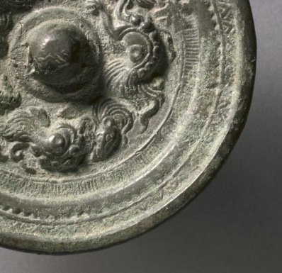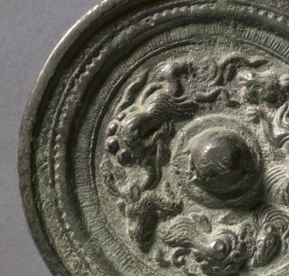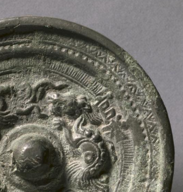 本品规格为直径10.2厘米,厚度1厘米。圆形,青铜质地,中央设半球形镜钮。镜背浮雕多组 “瑞兽”(似狮、虎、鱼等神兽 ),围绕镜钮分布,或奔腾、或盘绕,姿态生动;边缘饰连珠纹、几何纹,强化层次。“瑞兽” 是金代铜镜常见题材,融合中原 “祥瑞文化”(祈福辟邪 )与游牧审美(尚武崇力 )。
