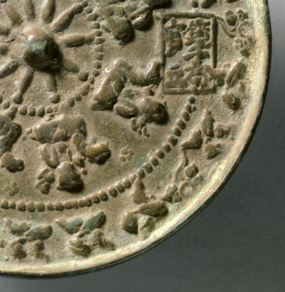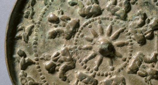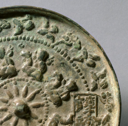 本品规格为直径13.3厘米,厚度0.8厘米。 呈圆形,青铜质地,中间设半球形镜钮(用于悬挂 )。 镜背核心是 “童子花卉” 纹(多组童子嬉戏,间饰花朵、瑞草 ),“童子” 寓意 “多子多福”(金代重视家族繁衍 ),“花卉” 象征 “美好吉祥”,右侧 “薛家造” 铭文既标作坊,也增铜镜 “身份标识”。此镜借纹饰与铭文,传递对 “家族兴旺”“生活美满” 的祈愿,是金代 “以镜传俗” 的典型。