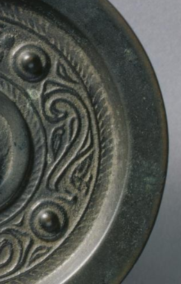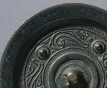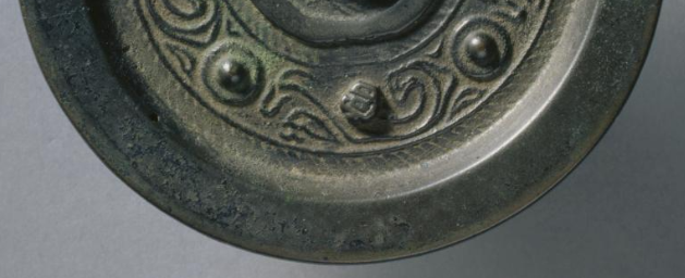 本品规格为直径10.5厘米,厚度1.1厘米。圆形,青铜质地,中央设半球形镜钮。镜背分两区,内区为同心圆弦纹(围绕镜钮的双层圆环 );外区饰 “乳钉 + 蟠螭纹” ——4 颗大乳钉(圆形凸起 )均匀分布,蟠螭纹(简化龙形 )缠绕乳钉,线条卷曲灵动,形成 “乳钉穿螭” 布局。