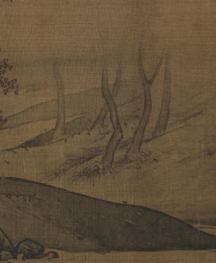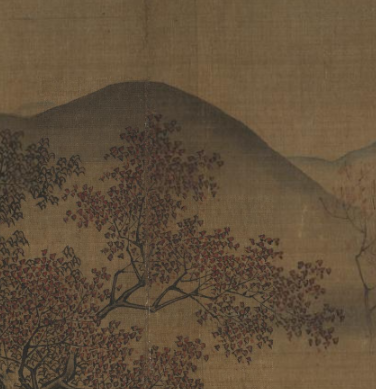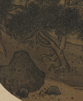 本品规格为23 x 21 厘米。圆形扇面为框,以山水为骨架,近景绘古树、磐石,中景衬人物与牛,远景连山峦,层次由近及远铺展,营造 “咫尺之图,写千里之景” 的空间感,是南宋 “边角山水” 向全景山水融合的体现。树木以细笔勾勒枝干,点染树叶,有墨绿、朱红层次;山峦用淡墨皴染,朦胧悠远;人物、牛虽小,却形态生动 —— 人物骑牛而行,似在赏景,牛的动态憨实,细节间见画家对生活的观察。