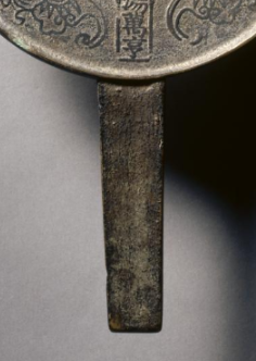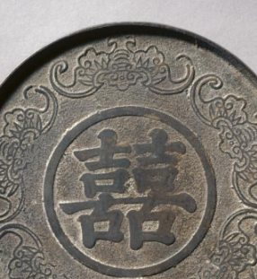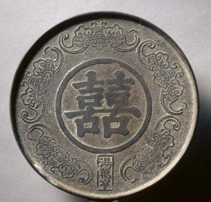 在清代,这种带柄 “囍” 字铜镜常作为婚嫁中的重要物品出现, 可能是女方的陪嫁之物,寓意着对新人婚姻幸福、生活美满的美好祝福。在婚礼当天,新娘梳妆打扮时使用此铜镜,也增添了婚礼的喜庆氛围。