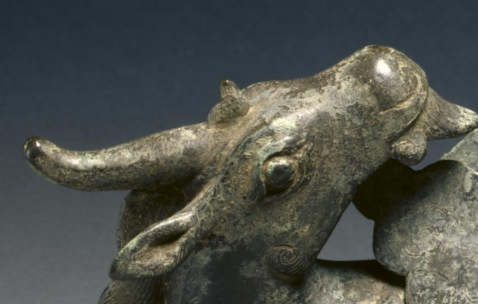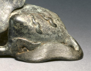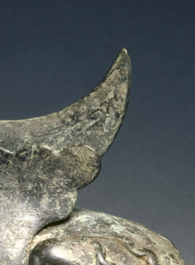 本品规格为10.6 x 21.2 厘米。以 “犀牛” 为原型,青铜铸造,呈现 “卧犀负月” 形态(犀牛伏卧,背负月牙形构件 )。表面因岁月氧化覆古朴包浆,犀牛肌肉纹理、月牙纹饰(似有浅浮雕 )清晰,展现金代 “仿生 + 神话” 造型工艺 —— 既写实(犀牛姿态、肌理 )又浪漫(背负月牙,呼应 “犀牛望月” 传说 ),尽显工匠巧思。