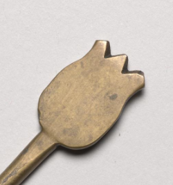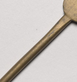 本品规格为10.5 x 1.6 x 0.4 厘米。主体为长条形铜杆,一端铸造成花卉状(似花苞形态 ),线条简洁,造型古朴,“花卉首” 设计兼具实用(插拔门销 )与装饰性,体现清代小五金件的工艺巧思。铜质为材,历经岁月形成温润包浆,呈现古铜色泽,表面留存使用痕迹与自然氧化层,见证清代门销的实际功能与时光沉淀。