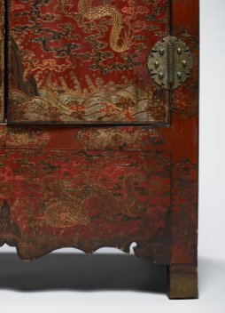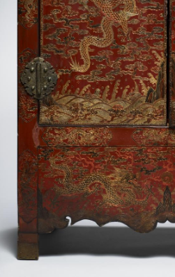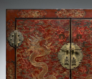 本品规格为152.4 x 89.5 x 41.9 厘米。为典型方角柜,柜体方正,上下连为一体,对开双门,以铜质合页、面叶、拉手加固,结构规整,体现清代家具的稳重制式。通体髹朱漆作底,以描金工艺绘云龙纹 —— 双龙矫健灵动,穿梭于云气间,辅以海水江崖纹,金漆与朱红底色碰撞,华丽庄重,云龙纹象征皇权,凸显器物等级。