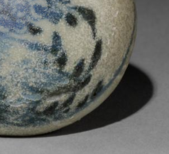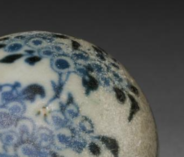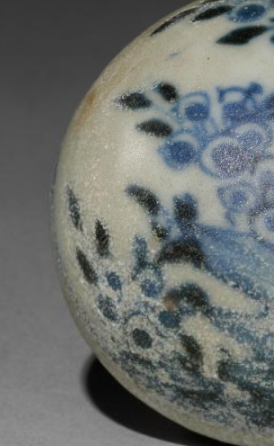 本品直径为3.6厘米,高度3厘米。呈规整球形,小巧精致,圆润饱满的形态,符合清代小型器物 “以小为美、以圆为吉” 的审美偏好,便于手持、把玩或收纳,体现实用与装饰的结合 。以青花绘花卉纹,花朵形态简约生动,枝叶舒展自然,虽笔触稚拙,却有质朴野趣。青花发色蓝中带灰,因岁月与工艺呈现出斑驳陈旧感,是清代民窑青花 “粗率而鲜活” 装饰风格的体现,反映当时民间对花卉吉祥寓意(如富贵、繁盛 )的追求 。
