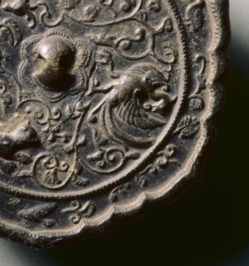 本品规格为直径20厘米,厚度1厘米。镜背纹饰丰富,中心是半球形镜钮,围绕钮的是缠枝花卉纹,其间浮雕瑞兽(似狮、似马等形态)、禽鸟(如鸾鸟)图案,动物造型生动,姿态各异,或奔腾、或展翅,缠枝纹婉转流畅,与动物纹相得益彰,外圈还有简洁的辅助纹饰,尽显唐代铜镜华丽大气、富有动感的艺术风格,反映当时工艺水平与审美。
