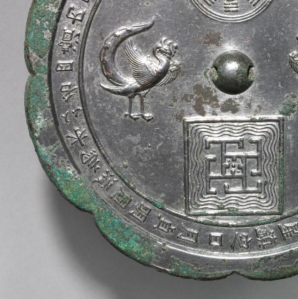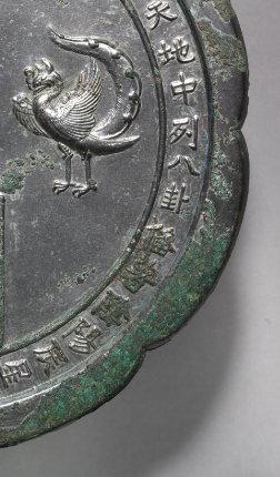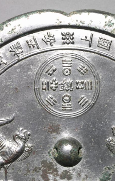 本品规格为直径22.5厘米,厚度1.1厘米。整体为菱花形,边缘呈花瓣状起伏,线条优美。镜背纹饰丰富且层次分明,有两只对称分布的凤鸟,造型生动,羽翼、尾羽细节清晰,姿态优雅,呈现出唐代对禽鸟纹饰的典型审美。还铸有八卦图案,蕴含道教文化内涵,反映唐代宗教文化对器物的影响 。环绕镜钮有一圈铭文,文字内容虽需进一步释读,但可推测与祈福、记事等相关,是研究唐代文字、思想的重要元素,铭文与纹饰、八卦图案相互配合,营造出神秘又庄重的氛围。