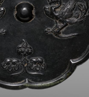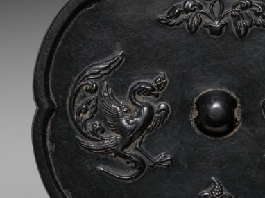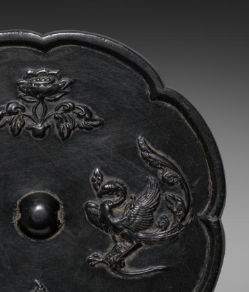 本品规格为直径14.8厘米,厚度1.1厘米。整体为菱花形,边缘呈花瓣状起伏,线条优美,是唐代流行的铜镜外形,体现出当时对曲线、自然形态的审美追求 。中间有圆形镜钮,用于手持或悬挂,方便使用。镜背主体纹饰为双鸾鸟,左右对称分布,鸾鸟造型生动,羽翼舒展,身姿灵动,口中似衔着花枝,姿态优雅。上下位置配有花卉图案,花朵、枝叶雕刻细致,与双鸾纹饰相呼应,整体构图均衡、和谐,营造出富贵、吉祥的氛围,反映唐代对禽鸟、花卉等自然元素的喜爱,以及追求美好的生活愿景。