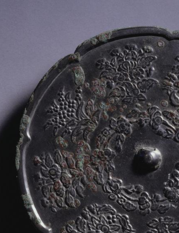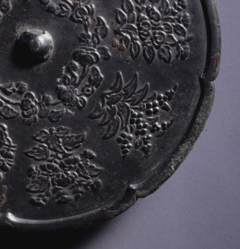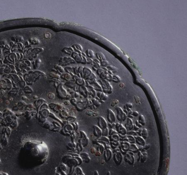 本品直径24.5厘米,厚度0.9厘米。呈八瓣 菱花形(边缘花瓣状 ),这是唐代铜镜标志性形制(唐代首创,象征 “花好月圆” )。中央设半球形镜钮(实用悬挂 + 构图中心 ),镜体轻薄,弧度贴合唐代 “尚巧” 审美。花卉呈 团状分布(多组圆形花朵 ),围绕镜钮对称排列,形成 “众花捧钮” 的视觉效果,呼应唐代 “对称、均衡” 的审美原则。花卉是唐代典型的 “宝相花”(或团花 )—— 花瓣层叠如莲,花蕊微凸似珠,花瓣边缘饰以细刻(若隐若现的脉络 ),融合莲花的圣洁与牡丹的华贵,暗合唐代 “宝相花” 象征 “祥瑞、繁盛” 的寓意。