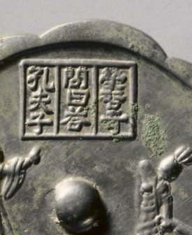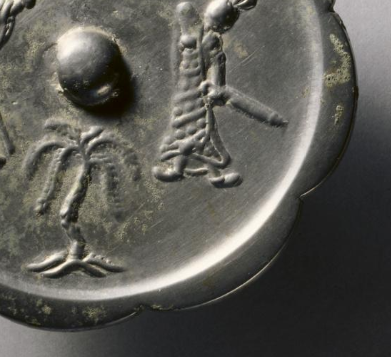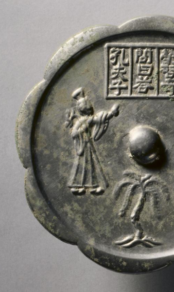 本品规格为直径12.7厘米,厚度0.9厘米。呈八瓣 菱花形(唐代流行的铜镜形制 ),边缘如花瓣舒展,中央设半球形镜钮(实用悬挂 + 构图中心 ),镜体轻薄却规整,契合唐代 “尚巧、尚圆融” 的审美哲学。镜钮两侧,浮雕 两位人物(左为孔子、右为老子 )—— 孔子拱手作 “问礼” 状(衣袂飘举 ),老子持杖作 “应答” 状(神态沉稳 ),下方饰 树木纹(象征 “杏坛问礼” 场景 ),生动还原 “孔子问礼于老子” 的历史典故。
