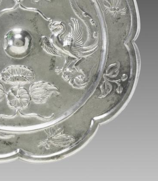 本品规格为19.1厘米,厚度1.1厘米。内区鸾鸟采用 高浮雕工艺,鸾鸟(凤凰 )形态 生动写实(羽翼舒展、尾羽卷曲 ),环绕镜钮对鸣、展翅,尽显 “唐代吉祥鸟” 的高贵。内区花卉饰花卉纹(莲花、牡丹 ),以 线刻 + 浮雕 结合(花卉浮雕饱满,藤蔓线刻流畅 ),形成 “满饰缠绕” 效果,传递 “唐代庭院花卉繁茂,鸾鸟栖息其间” 的世俗吉祥。外区蝴蝶云纹饰蝴蝶纹(灵动)+云纹(飘逸),以线刻 工艺呈现,形成 “蝴蝶飞舞,云气环绕” 效果,强化 “吉祥氛围”。
