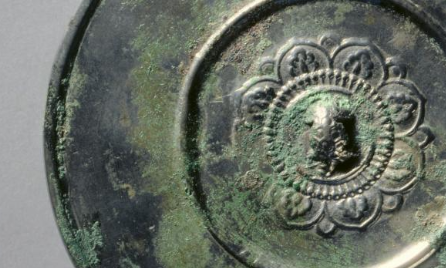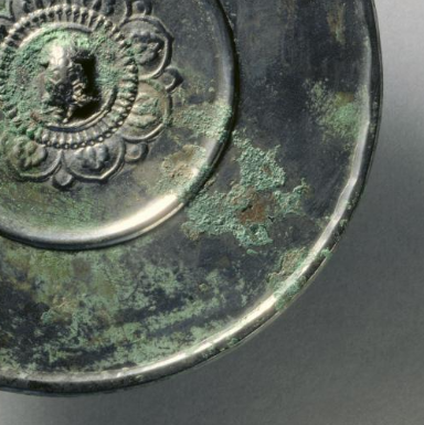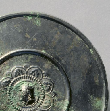 本品规格为直径12.5厘米,厚度0.7厘米。圆形,延续唐代铜镜 “天圆” 传统。中央设 兽形钮(实用悬挂 + 构图中心 ),钮外环绕一周凸起的 “弦纹圈”,将镜背划分为 “钮区” 与 “素面区”,简洁中暗藏秩序感。 兽钮外环绕 多层莲瓣纹(宝相花的简化形态 ),莲瓣层叠如佛座莲花,中心兽钮形态模糊却自带 “威严感”(或为瑞兽、或为佛像简化 ),形成 “兽钮坐莲” 的神秘场景,暗合唐代 “佛教世俗化” 的文化特征。