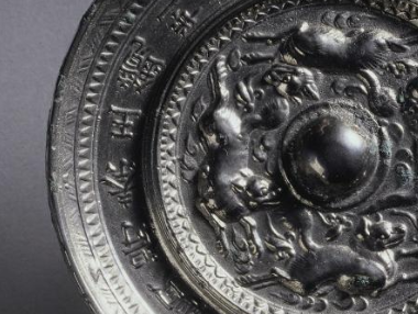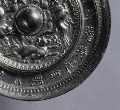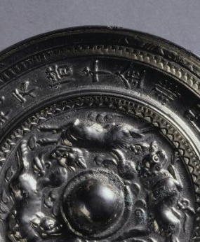 本品规格为直径9.6厘米,厚度0.9厘米。镜背分 三区(内区、外区、边缘区 ),内区饰 高浮雕瑞兽(或为狮子、狻猊 ),外区铸 环状铭文,边缘区饰 几何纹,形成 “瑞兽护佑,铭文祈福,几何为界” 格局,呼应唐代 “瑞兽象征祥瑞,铭文寄托祈福” 的文化心态