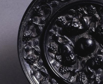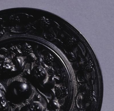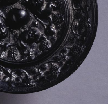 本品规格为直径8.2厘米,厚度1厘米。圆形,符合唐代 “天圆” 宇宙观。中央设半球形镜钮(伏兽钮变体 ),既是实用悬挂点,又成为纹饰布局的 “圆心”,撑起 “内密外疏” 的满饰构图。延续葡萄纹主题,葡萄串、藤蔓铺满边缘,间或点缀 小花、卷草(简化造型 ),与内区呼应,构建 “内外联动” 的满饰效果。