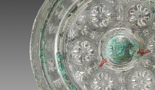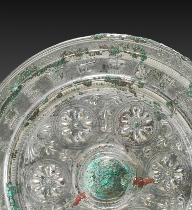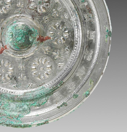 本品规格为直径16.6厘米,厚度1.5厘米。 采用 高浮雕 工艺(“浮出” 镜面约 1 - 2 毫米 ),团花(或为宝相花、莲花 )形态 饱满华丽(花瓣层叠,花蕊浮雕清晰 ),环绕镜钮排列,尽显 “唐代繁花” 的富贵气象;铸楷书铭文(长命富贵,千秋万岁),字体规整,与纹饰形成 “文字为经,团花为纬” 的祈福叙事,传递 “长命百岁,富贵安康” 的美好期盼; 饰 锯齿纹 + 弦纹,线条细密,强化 “边界感”,象征 “世俗与祈福的分隔”; 团花与铭文 相互穿插(铭文环绕团花 ),强化 “繁花簇拥祈福” 意象,体现唐代 “以繁花庆世俗,以铭文祈长命” 的社会心态。