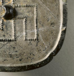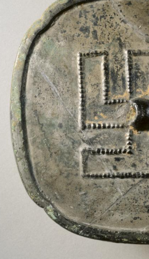 本品规格为0.9 x 14.3 厘米。呈 亚字形(方形委角,边缘微微圆弧 ),这是唐代铜镜创新形制之一(突破圆形传统 )。中央设半球形镜钮(实用悬挂 + 构图中心 ),镜体轻薄却规整,契合唐代 “尚新、尚巧” 的审美哲学。卍字纹占据镜背 全部空间(无其他纹饰 ),以镜钮为中心,向四方延伸,形成 “卍字绕钮” 的对称构图,呼应唐代 “尚对称、尚圆满” 的审美原则,更暗合佛教 “卍字象征无限、永恒” 的文化寓意。