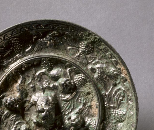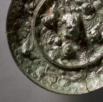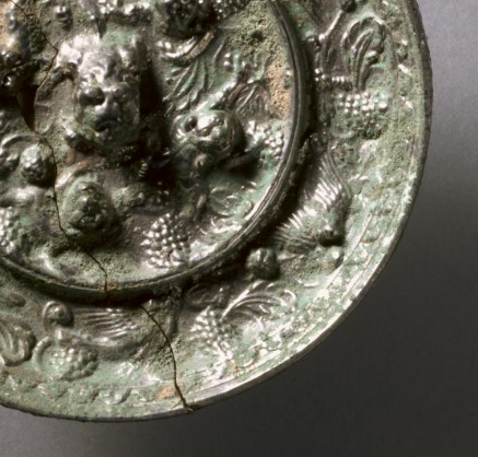 本品规格为直径11.2厘米,厚度1.3厘米。整体为圆形,虽有破损(可见明显裂纹 ),但仍保留基本的圆形轮廓,中间有凸起的镜钮,用于手持或悬挂,是唐代铜镜常见的实用造型 。镜背纹饰极具特色,以镜钮为中心,环绕分布着海兽(形态似狮、豹等,造型生动,富有动感 ),海兽间穿插着葡萄、藤蔓纹,葡萄颗粒饱满,藤蔓缠绕,营造出繁密、生动的视觉效果。