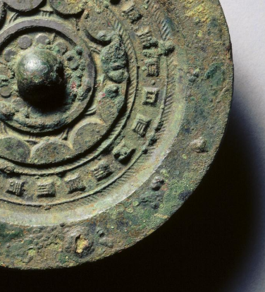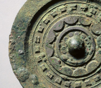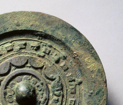本品规格为直径14.1厘米,厚度1.3厘米。整体呈圆形,中央有半球形镜钮,这是西汉铜镜常见的造型,方便使用者手持或悬挂,以便日常照面梳妆。铜镜历经岁月, 表面覆盖着斑驳的铜锈,呈现出古朴的青绿色,见证了历史的沧桑变迁。以镜钮为中心向外看,靠近镜钮处有一圈连弧纹,线条流畅自然,形状类似花瓣,给铜镜增添了灵动与美感, 同时也体现了当时人们对自然形态的模仿和艺术加工。在连弧纹外侧,还分布着一些简洁的几何纹饰,与连弧纹相互映衬,丰富了镜背的装饰层次, 整体布局规整有序,展现出西汉时期独特的审美观念。