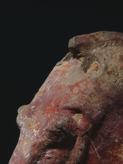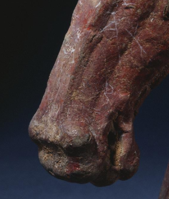 本品规格为15.3厘米。以写实手法塑造马头,轮廓线条硬朗,马的面部肌肉、眼部轮廓、口鼻形态刻画清晰,虽历经岁月,仍能看出骏马的矫健与神韵,体现西汉工匠对动物形态的观察入微。采用陶土烧制,表面残留红彩痕迹,历经千年,陶质斑驳古朴,红彩与土锈交织,呈现出厚重的历史质感,见证岁月侵蚀。