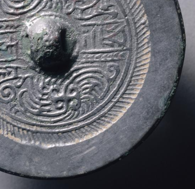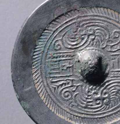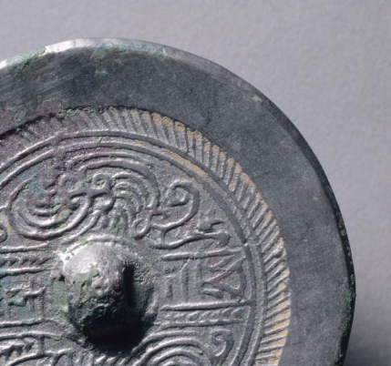 本品规格为直径7.7厘米,厚度0.8厘米。呈圆形,中央设半球形镜钮,符合中国古代铜镜经典造型,方便手持或悬挂照面。历经岁月,边缘有自然铜锈与包浆,呈现古朴厚重质感,见证历史沧桑 。以镜钮为中心,分布规整博局纹(含 T、L、V 形线条 ),如 “规矩” 划分镜背空间,构建秩序感。博局纹间,蟠螭纹蜿蜒缠绕,线条灵动,似有生命力,展现西晋对神兽题材的喜爱与雕刻技艺。辅助纹饰(如边缘弦纹、短斜线纹 )丰富层次,让整体图案繁而不乱 。