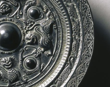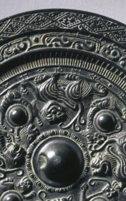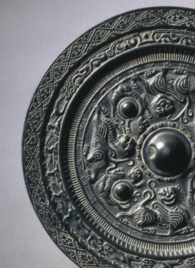 本品规格为直径19.6厘米,厚度1.3厘米。采用 高浮雕 + 线刻 工艺,瑞兽(或为龙虎、辟邪 )躯体 “浮出” 镜面约 2 - 3 毫米,鳞片、毛发(以线刻表现 )清晰可触;瑞兽形态 诡谲灵动(或奔跑、或嬉戏 ),传递 “玄学尚自然” 的洒脱;半球形小钮(高约 1 毫米 ),表面光滑,与主钮呼应,传递 “天星镇守” 意象(四乳对应 “北斗四星” ); 饰 菱形纹 + 云气纹,线条简洁,强化 “边界感”,象征 “世俗与玄学的分隔”。