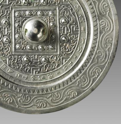本品规格为直径16.9厘米,厚度1.1厘米。整体呈圆形,便人们手持使用。铜镜中央有一个半球形镜钮, 其主要作用是便于使用者系上丝带或其他悬挂物,方便手持或者悬挂铜镜,以满足日常照面梳妆的需求。 铜镜的边缘较为宽厚,不仅增加了铜镜的稳定性,也在一定程度上对镜面起到了保护作用。以镜钮为中心,镜背有典型的博局纹(规矩纹),包含 T、L、V 形等几何纹饰。这些纹饰线条规整、硬朗,相互交织,构成了富有秩序感的图案框架。 博局纹在古代被认为与天地宇宙的秩序相关,体现了当时人们对宇宙观和哲学思想的理解 。