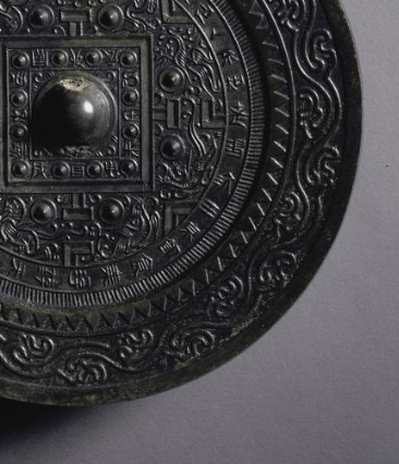 本品规格为直径16.6厘米,厚度1.1厘米。整体呈圆形,中央设半球形镜钮,为铜镜常规造型,便于手持照面。因岁月侵蚀,表面有斑驳绿锈与包浆,显古朴厚重, 留存历史沧桑感。以镜钮为中心,布局是典型博局纹(规矩纹,含 T、L、V 形几何纹 ),线条硬朗规整;博局纹间雕刻神兽形象,形态生动,或为青龙、白虎等祥瑞神兽, 体现新朝对神兽祥瑞的尊崇;镜缘有卷云纹等辅助纹饰,与主体呼应,丰富视觉层次,营造神秘氛围。
