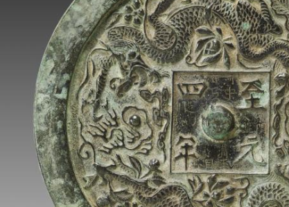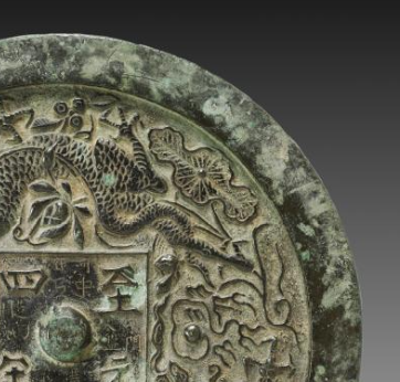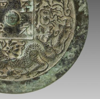 本品规格为直径23.4厘米,厚度1.1厘米。 圆形,青铜质地,中央设半球形镜钮(实用悬挂 + 构图中心 )。镜背浮雕 双龙戏珠 主题(两条巨龙环绕镜钮,龙身鳞片、爪牙、龙须清晰,似追逐戏耍 ),搭配花卉、云纹(填充空白,强化层次 )。龙纹是元代铜镜典型题材,既继承中原 “龙为皇权象征” 传统,又融入游牧民族对 “力量、权威” 的崇尚。
