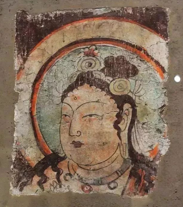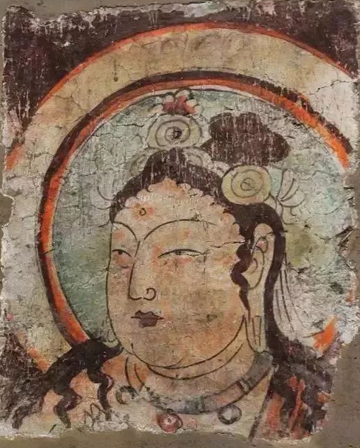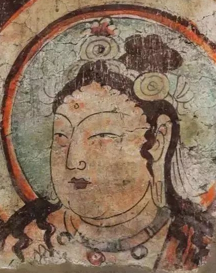 画面内容:这是一幅菩萨头部及上半身局部壁画。菩萨面容丰满圆润,眉眼细长,微微低垂,神态安详,嘴角似有一丝若有若无的笑意,尽显慈悲之态。菩萨头戴精美的头冠,头冠上装饰有圆形等形状的饰品,额间有吉祥痣 。头发卷曲,部分发丝垂落于肩头。