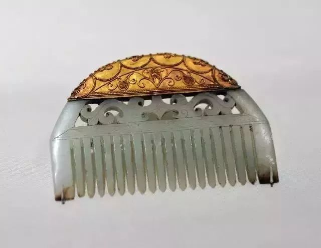 整体造型:整体呈半圆形,设计精巧。上部为金质梳柄,下部是玉质梳齿部分 。