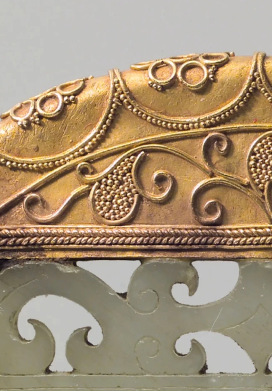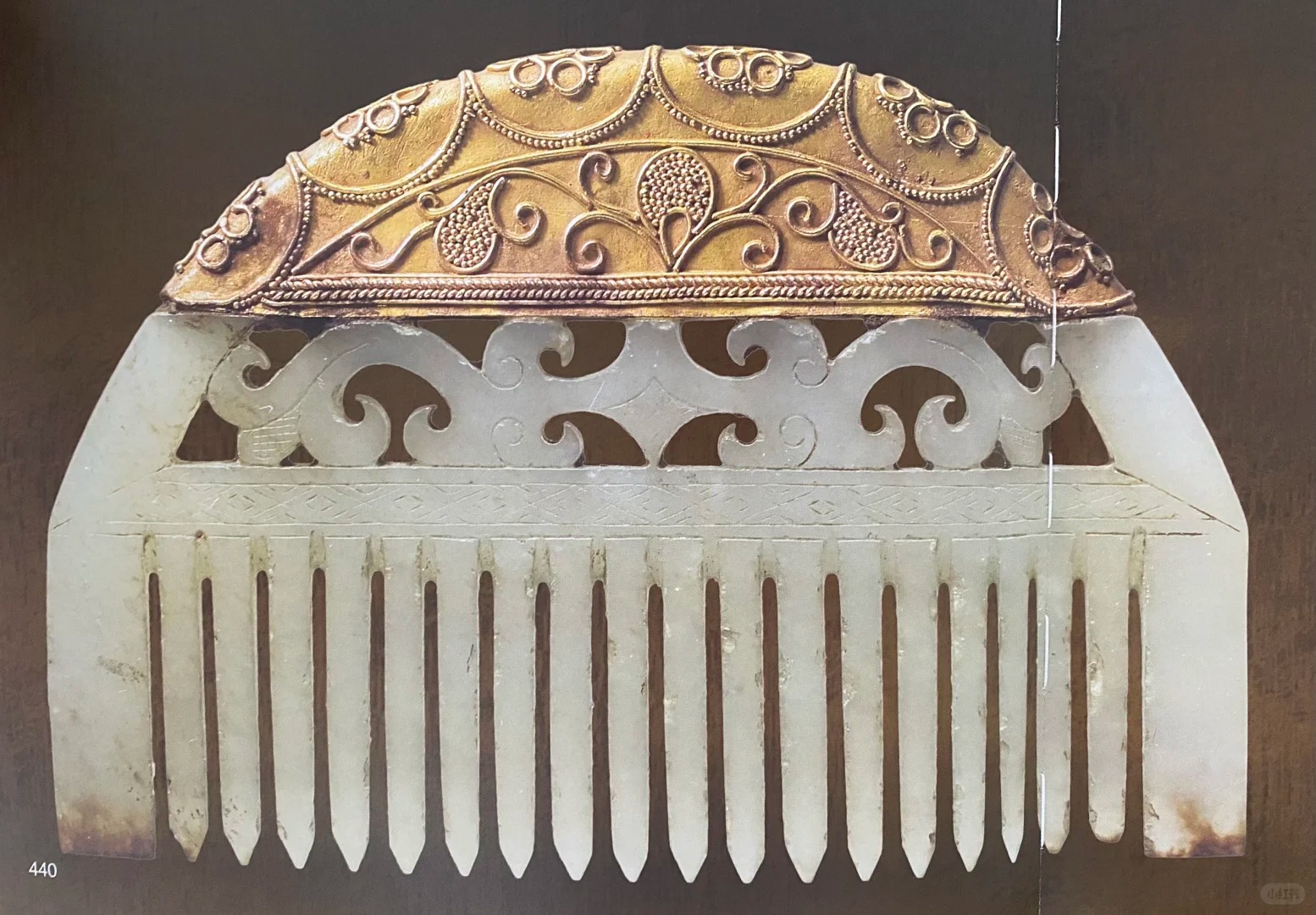 装饰细节:金质梳柄部分色泽金黄,上面雕刻有精美的花纹,花纹线条细腻流畅,可能是唐代常见的卷草纹、云纹等,展现出唐代高超的金银器雕刻工艺。玉质部分采用的玉料质地温润,颜色可能为淡绿色或白色等,梳齿排列整齐细密,边缘打磨光滑,不易损伤头发。玉质梳身部分还有镂空雕刻的装饰,增加了器物的层次感和美感 。虽然历经岁月,部分地方可能有轻微的磨损和沁色,但仍无损其精致华丽的特质 。