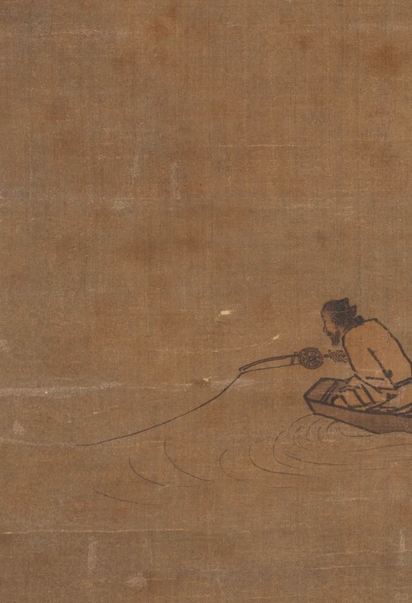 画面内容:画面构图极为简洁,主体是一位独自在寒江上垂钓的渔翁。他坐在一叶扁舟之上,身体微微前倾,专注地握着鱼竿,似乎在等待鱼儿上钩。舟上还放置着一些渔具和蓑衣,增添了生活气息。除了渔翁和小船,画面大部分留白,仅用寥寥数笔勾勒出江面的涟漪,却巧妙地营造出寒江空旷、寂静的氛围,给人以无限的遐想空间。
