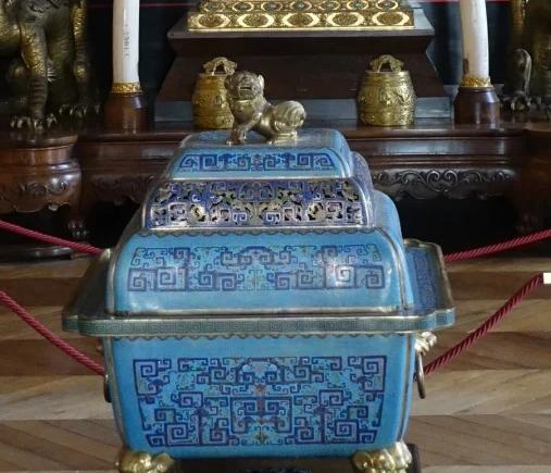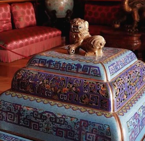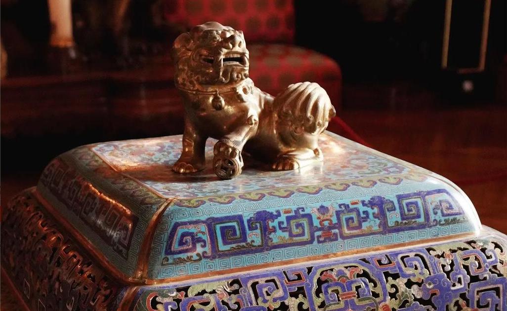 装饰细节:盒身主体为蓝色珐琅釉,色彩鲜艳且均匀。表面装饰有复杂的几何纹图案,可能是回纹等传统纹饰,线条流畅规整,展现出高超的掐丝工艺。盒盖上有镂空装饰,既美观又具有实用性,可能用于散发盒内香气等。盒盖上还装饰有金色的瑞兽雕塑,瑞兽造型生动,工艺精湛,与蓝色的盒身形成鲜明对比,凸显出器物的华贵。此外,器物边缘可能有鎏金装饰,进一步增添了华丽感 。