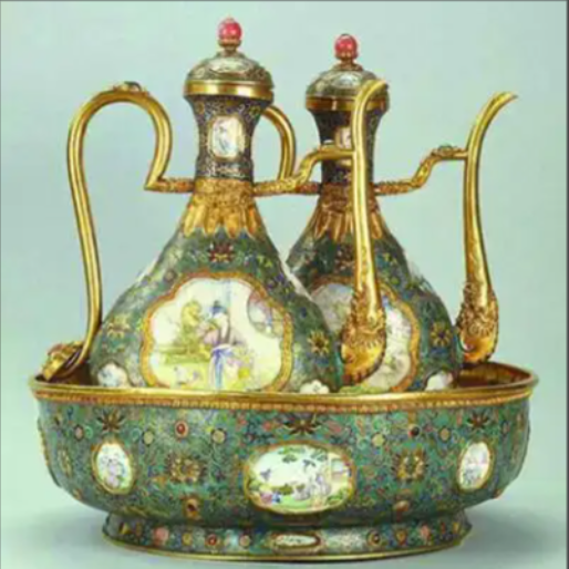 装饰细节:主体以蓝色珐琅为底色,上面装饰有精美的金色花纹,花纹细腻繁复,展现出高超的掐丝工艺。壶身多处开光,开光内绘有侍女等人物图案,人物形象生动,服饰、表情等细节刻画入微,背景场景丰富,如庭院、花卉等,展现出清代宫廷绘画的风格。壶流和把手部分有鎏金装饰,且造型似龙,龙头雕刻精细,栩栩如生 。部分区域可能还镶嵌有宝石,进一步提升了酒壶的奢华程度。
