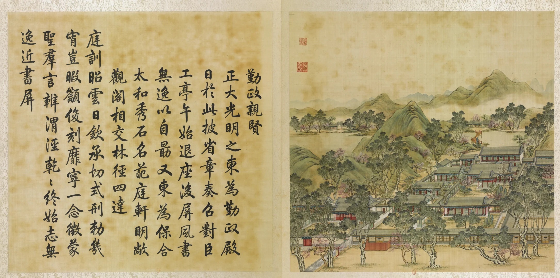 文字内容:每幅画旁都配有相应的题咏诗文,这些诗文多为乾隆皇帝所作,或描绘景观特色,或抒发情感感悟,与画面相互映衬,进一步丰富了作品的文化内涵。字体多为楷书或行书,书法工整秀丽,具有较高的艺术价值。