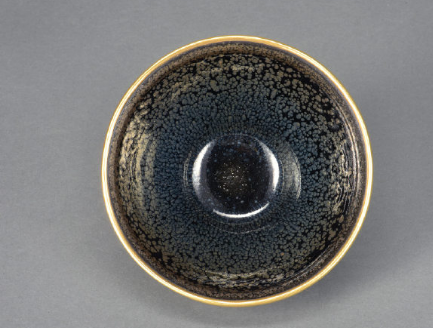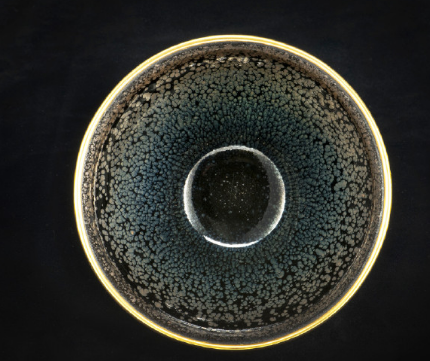 建窑油滴天目茶碗内外佈满银色斑纹,散发蓝色等光芒,如梦似幻。高:7.5 cm、口径d:12.2 cm、底径bd:4.2 cm,口沿镶金釦,更添奢华。重349克,拿在手上稳定舒适