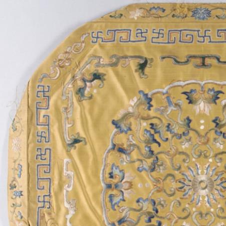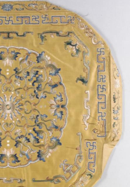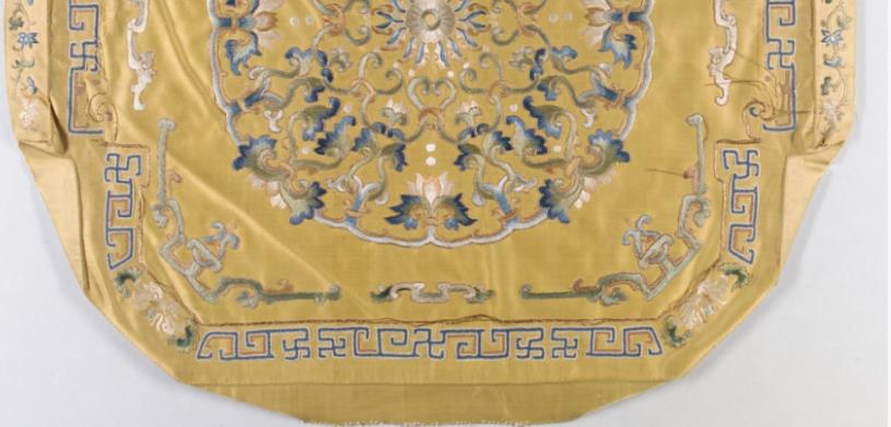 丝绸金属线;在丝绸上尺寸:15 1/2 x 16 1/2英寸(39.37 x 41.91厘米) 分类:绣花纺织品座垫套表面可能辅以刺绣或鎏金装饰,常见题材包括云龙纹、缠枝莲花或道教符号(如“五岳真形图”),以呼应皇权象征。这些图案多采用金线或彩色丝线绣制,突出乾隆朝“繁复华丽”的审美风格,增强视觉冲击力.