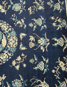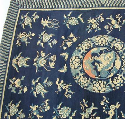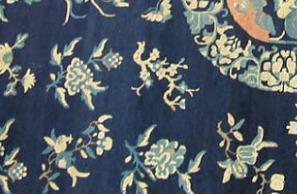 以毛、丝、棉及金银线为原料,制作栽绒毯、缂毛毯、绣花毯等类型,其中金线地或丝绒质地彰显皇室尊贵例如宁夏毯常用木红、姜黄等传统天然染料染色纹样融合文化元素,如佛教符号(西藏毯)、龙纹(甘肃毯)及吉祥图案;北京地毯按清宫“如意馆”画稿设计,常见海水江牙纹、二龙戏珠或《玉堂富贵》主题,象征权力、祥瑞与儒家伦理代表作品如乾隆朝紫红地花卉栽绒毯