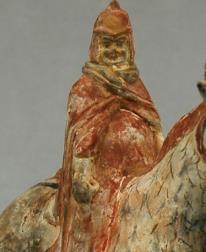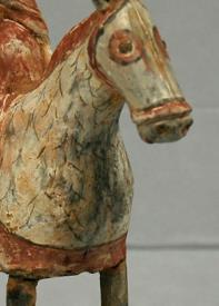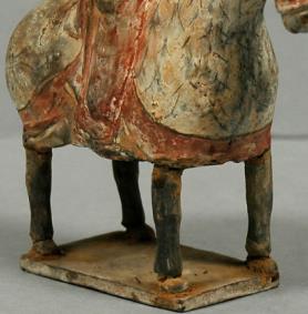 高8英寸(20.3厘米);L.7 1/2英寸(19.1厘米); 宽2 5/8英寸(6.7厘米)整体呈 “人骑于马” 的立式造型,比例协调,姿态生动,打破了汉代陶俑 “规整肃穆” 的风格,更具动态感与生活化气息。马匹身躯饱满,四肢直立整体造型既符合现实中骑马的生理结构,又通过艺术化处理强化了人物与马匹的互动感,尽显六朝陶塑 “写实与写意结合” 的特点。